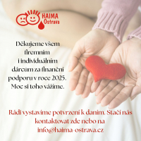 Spolek HAIMA Ostrava, z. s. vznikl v prosinci 1996 a působí při dětském hematoonkologickém oddělení Fakultní nemocnice v Ostravě. Našim hlavním cílem je zkvalitnění podmínek pro péči o vážně nemocné děti a usnadnění jejich integrace do běžného života. Děkujeme, že nám pomáháte. JEN SPOLEČNĚ TOHO DOKÁŽEME VÍC.