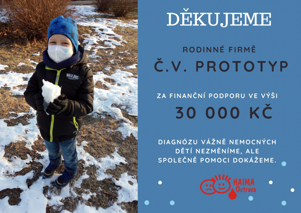 Děkujeme Č.V. Prototyp, že nám pomáháte pečovat o onkologicky či chronicky nemocné děti. Léčba vážně nemocného dítěte je vždy velká rána pro celou rodinu. Nezasáhne jen dané dítě, ale i sourozence, rodiče, prarodiče, tety, strejdy...