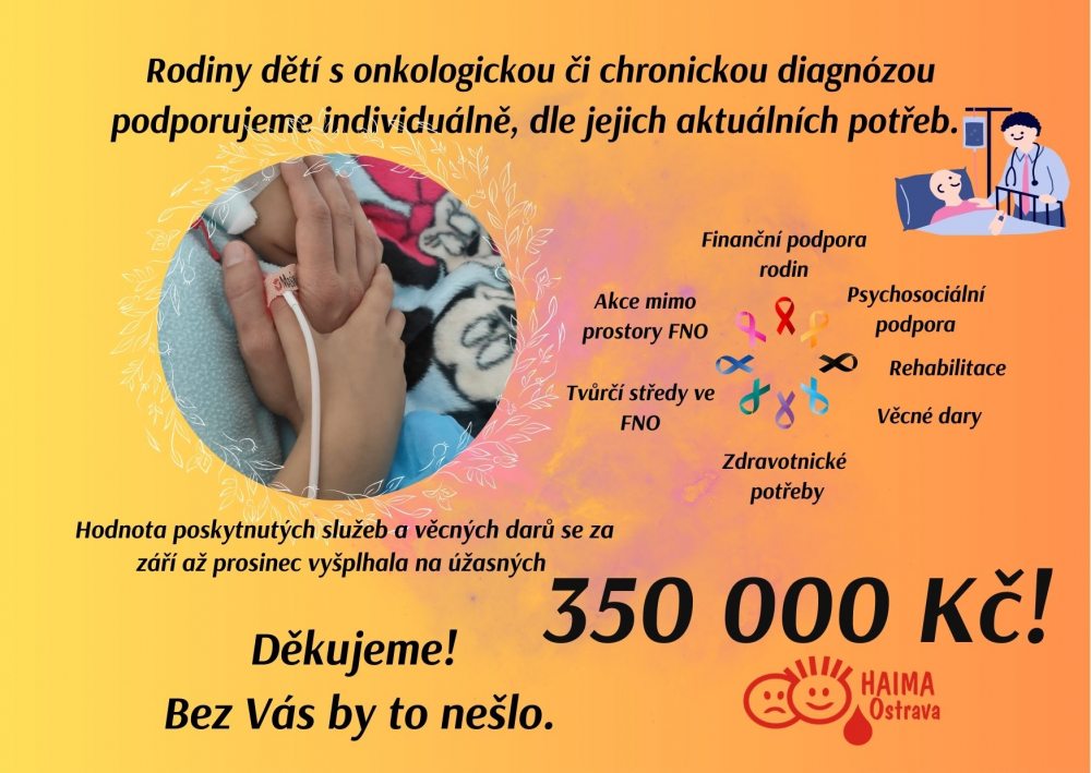 350 000 Kč - to je hodnota poskytnutých služeb a finančních/věcných darů, které jsme mohli rodinám nabídnout v období září-prosinec 2025.